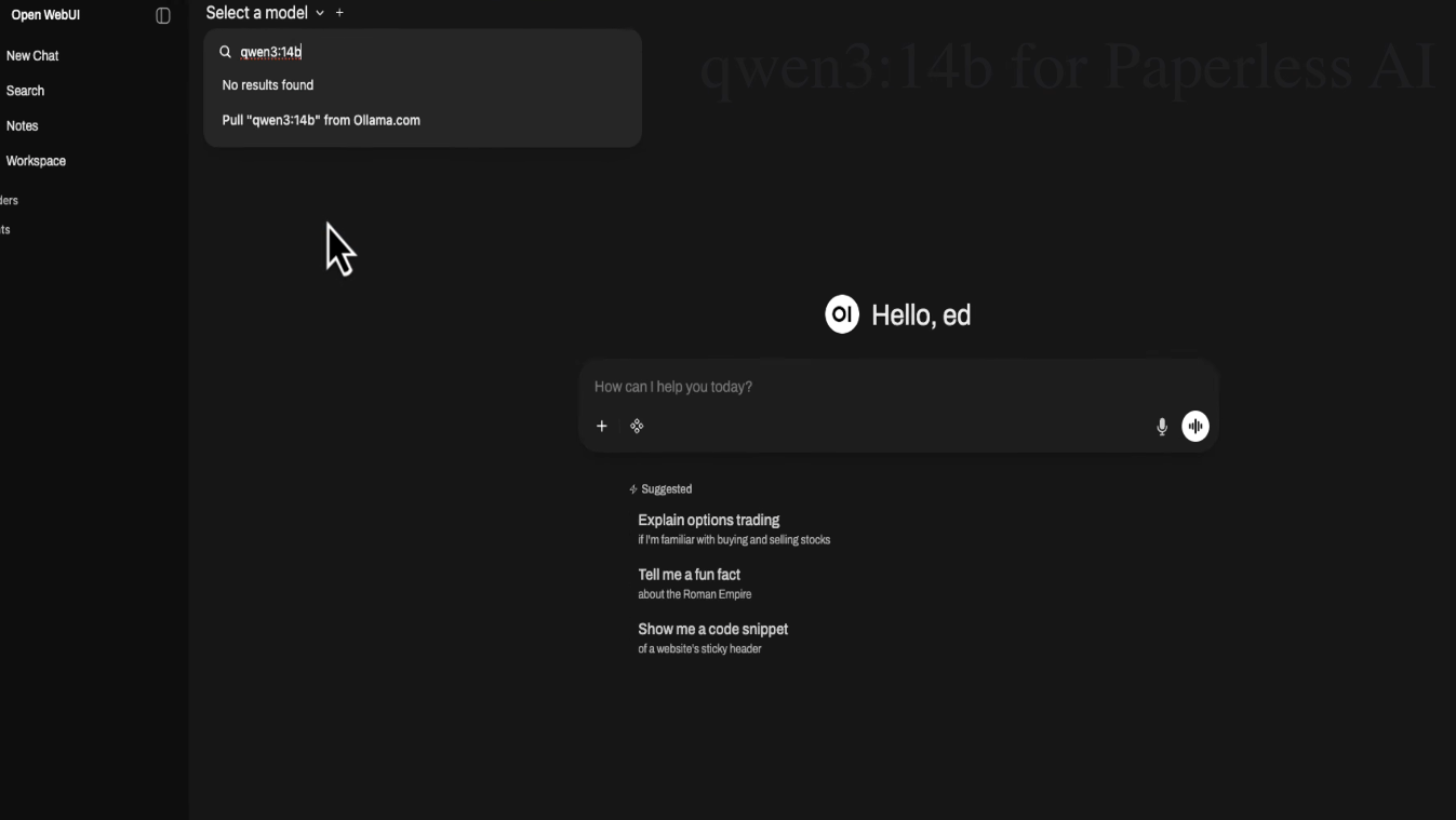At the top of Open WebUI you'll see a field that says select a model. We haven't got any models yet, so we need to grab two that I've found work best with Paperless.