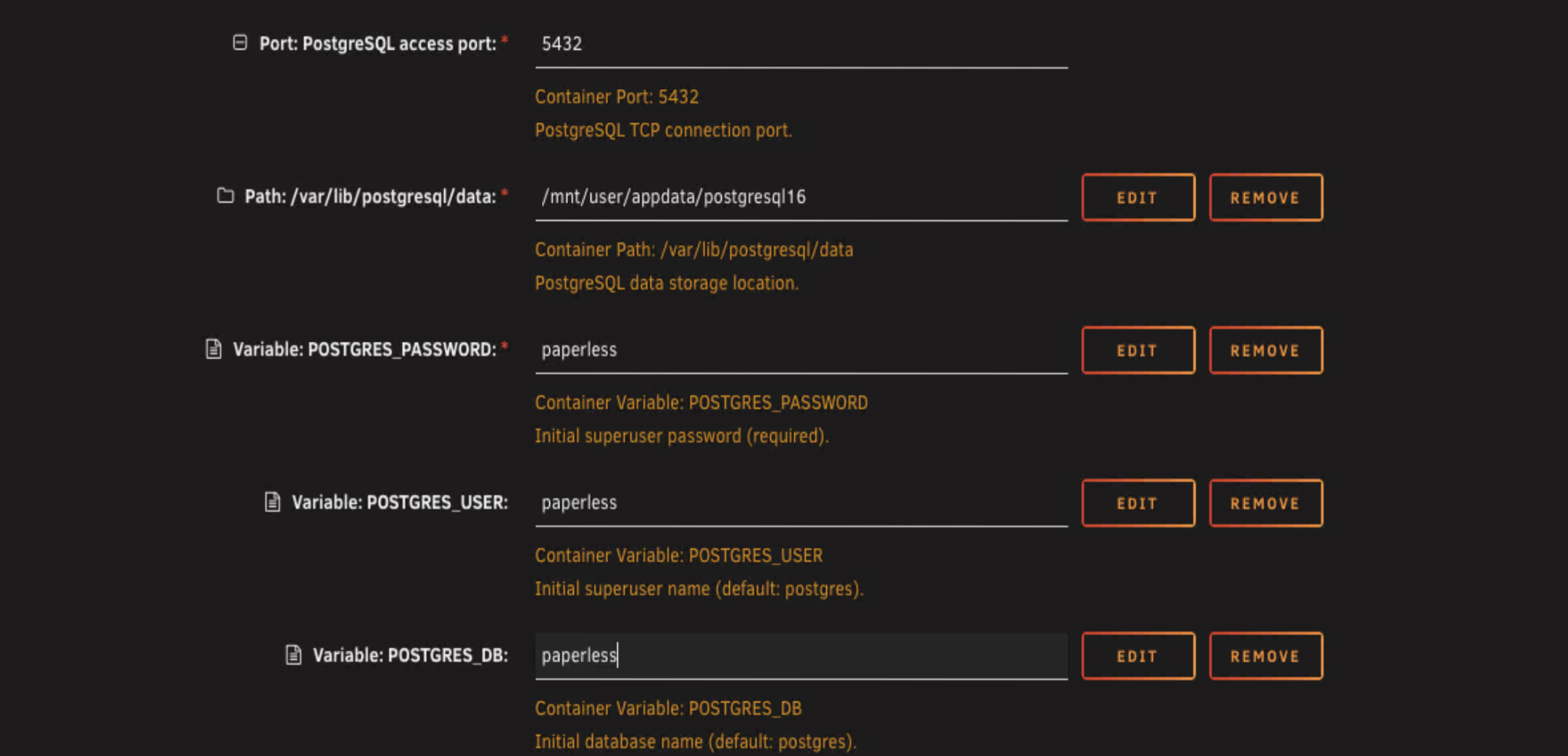 VariablePAPERLESS_DBPORT5432Postgres port (only change if you have another Postgres instance)
